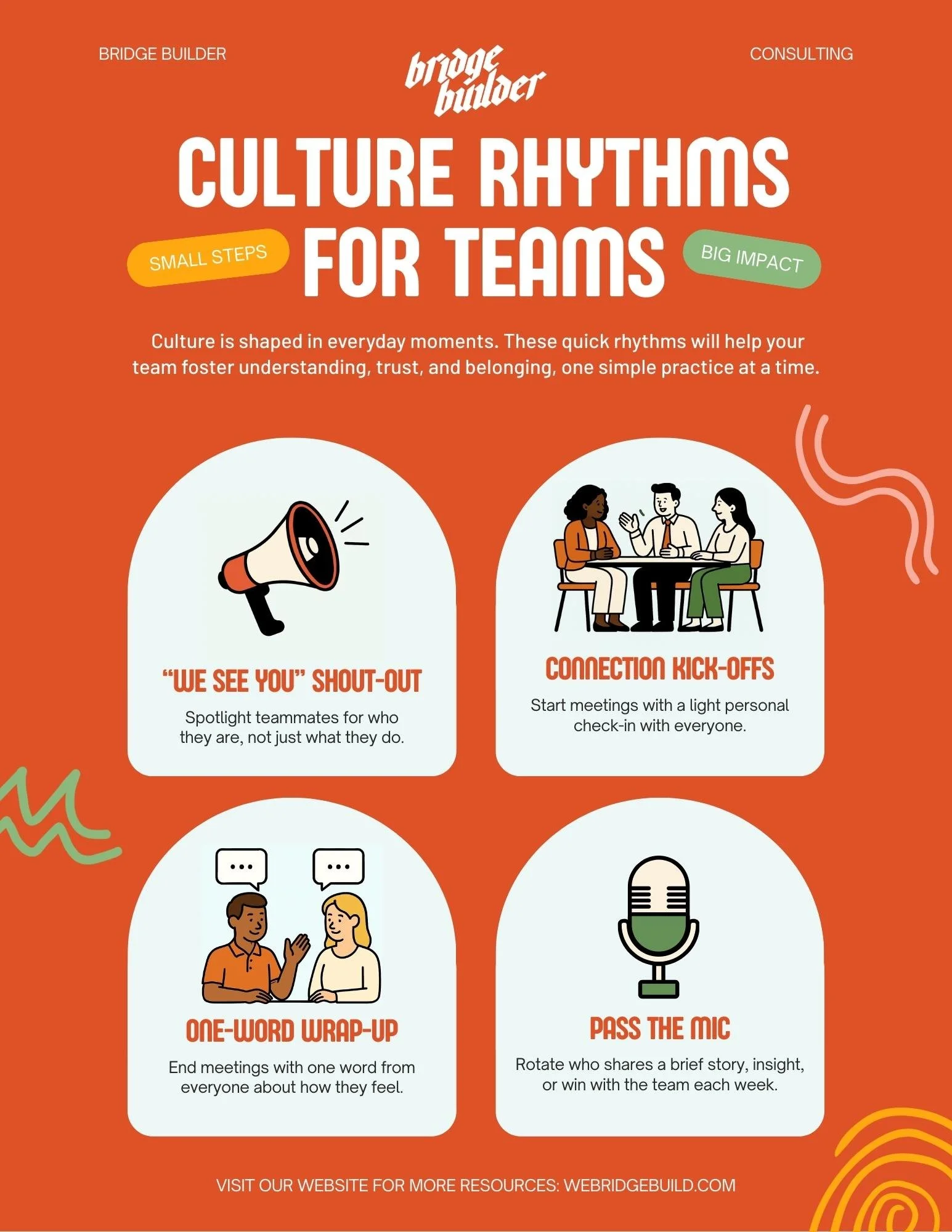 Culture isn’t just built in big retreats or strategic plans; it’s shaped in the rhythms of daily interaction. Culture Rhythms for Teams is a simple, flexible tool offering quick group practices designed to strengthen trust, connection, and belonging over time. Use it to open meetings, wrap up team huddles, or reset the energy in the room, one rhythm at a time.