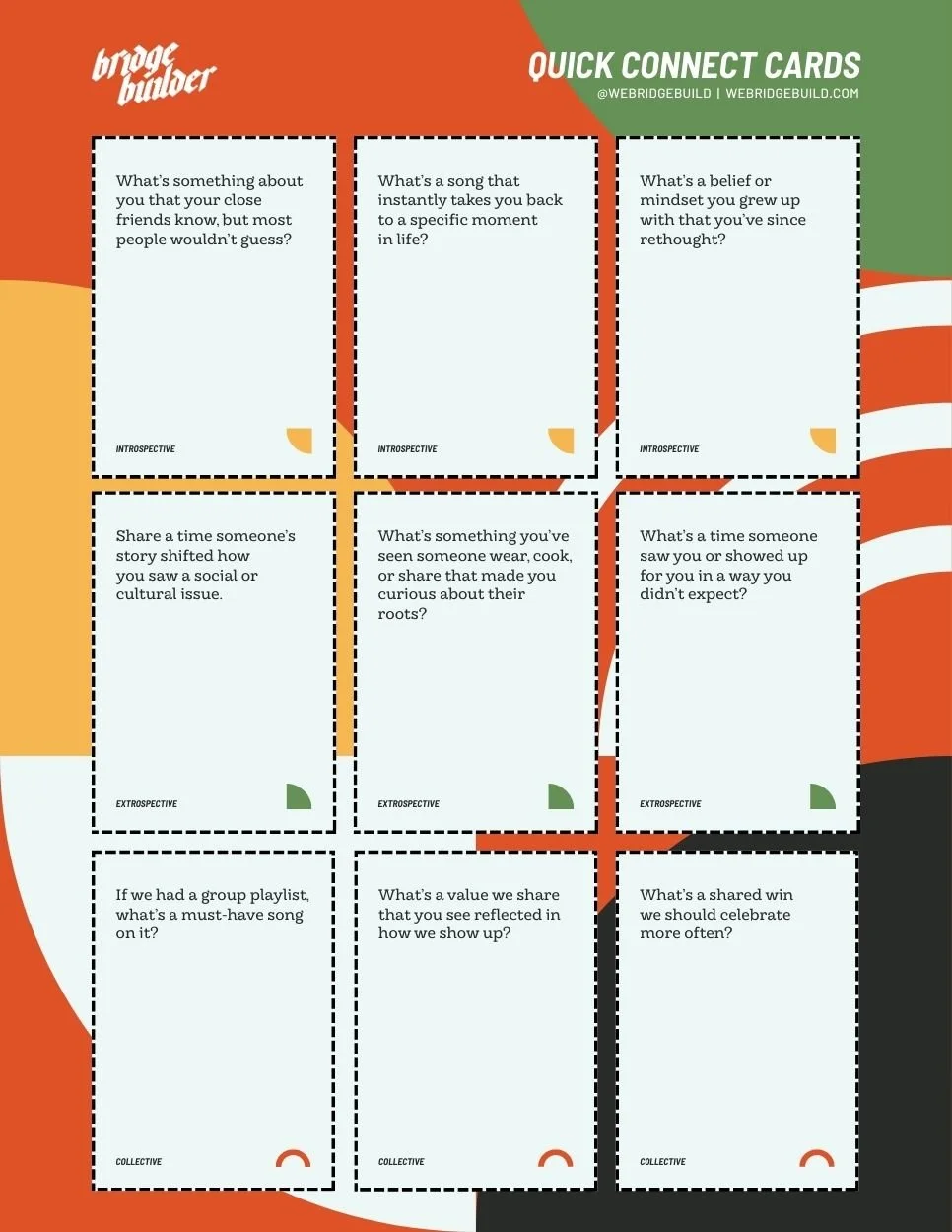 This Lite Edition is a free sample of the full Bridge Builder Conversation Deck, a tool designed to spark meaningful, fun, and culturally rooted conversations. Built around the Bridge Builder framework (Who Am I? Who Are They? Who Are We?), these prompts work anywhere connection matters: in meetings, at events, or around the dinner table.